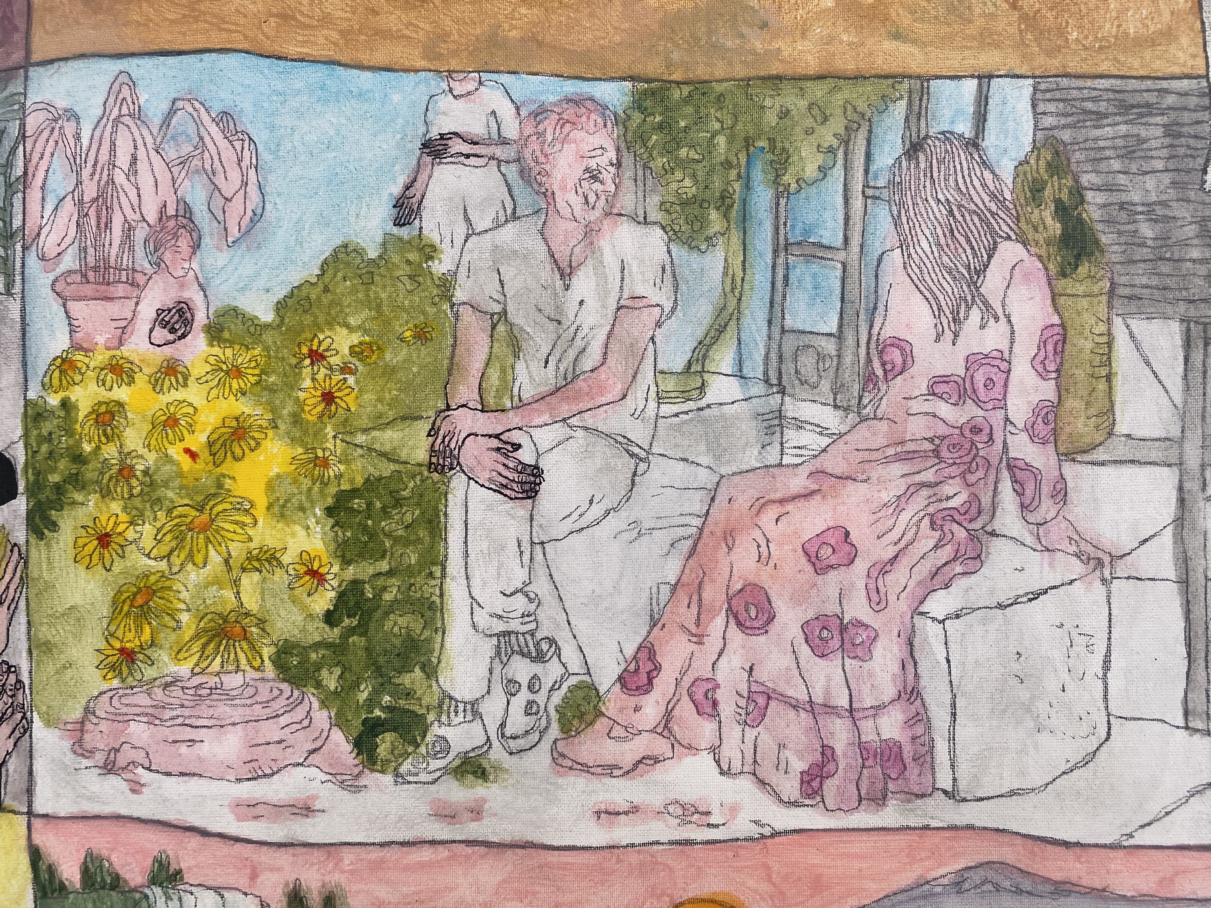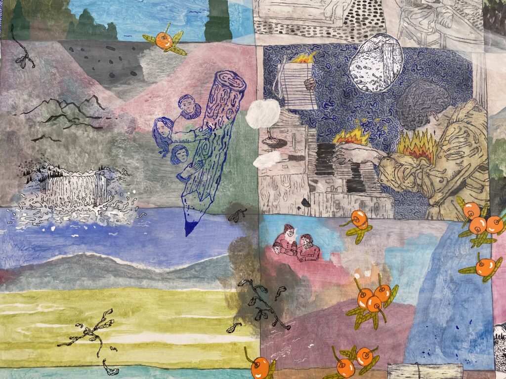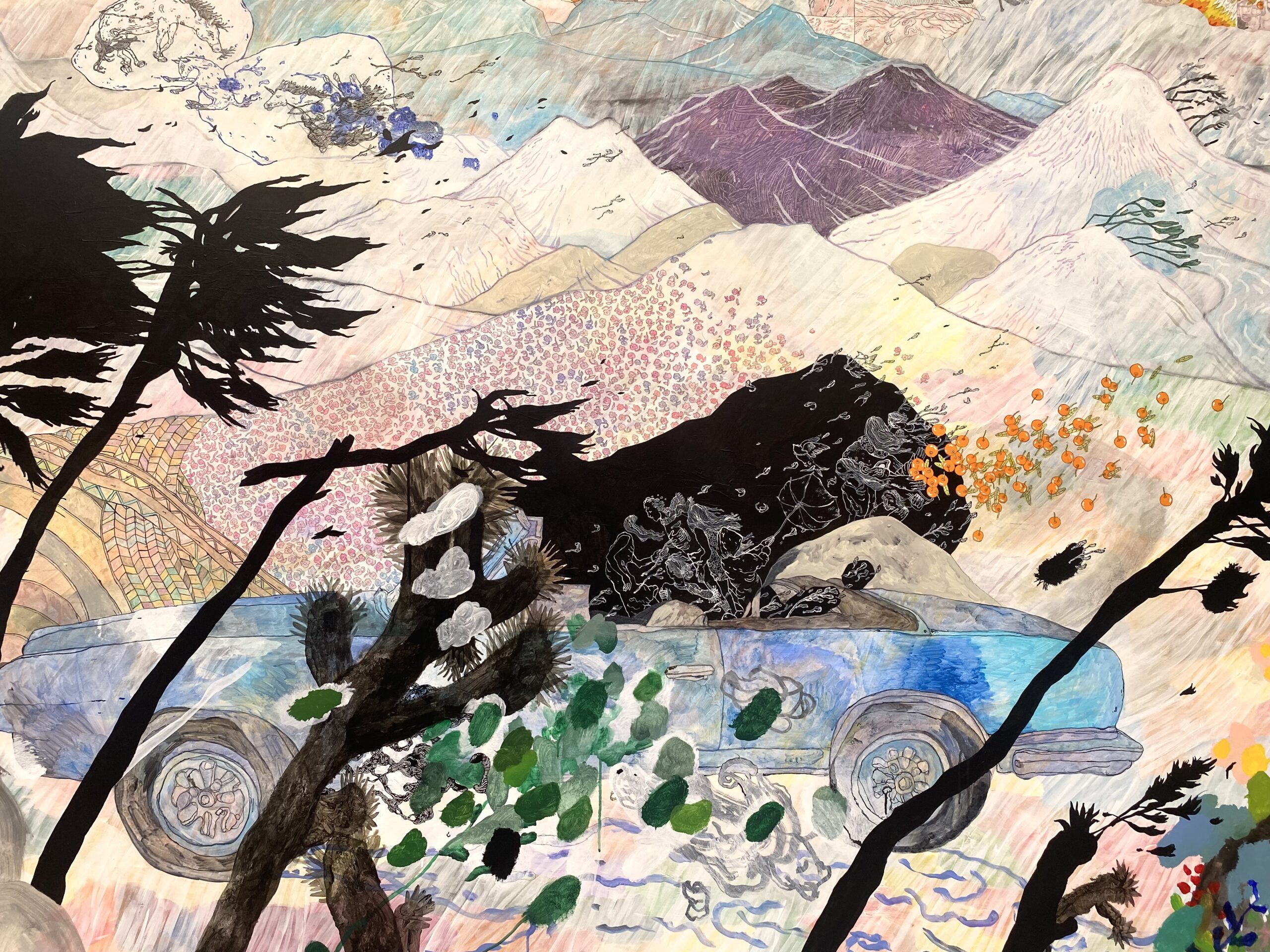 Σ.Ρ. Είναι, ναι, μπορείς να το πεις αυτό, έχει μια αφήγηση κινηματογραφική η δουλειά μου, ακόμα και στα πιο στατικά έργα. Αλλά πλέον νομίζω ότι έχω τραβήξει λίγο παραπάνω το θέμα της αφήγησης, γιατί είμαι πολύ υπέρ της αφήγησης στην τέχνη. Υπάρχουν καρέ που θυμίζουν graphic novel ή comics και έχουν κάποια αφήγηση, σε αντιπαράθεση με πιο ζωγραφικές επιφάνειες, όπως είναι τα σημεία όπου υπάρχουν τοπία. Είναι ένα πάντρεμα δυο τεχνικών που εμένα με ενδιαφέρει πολύ.