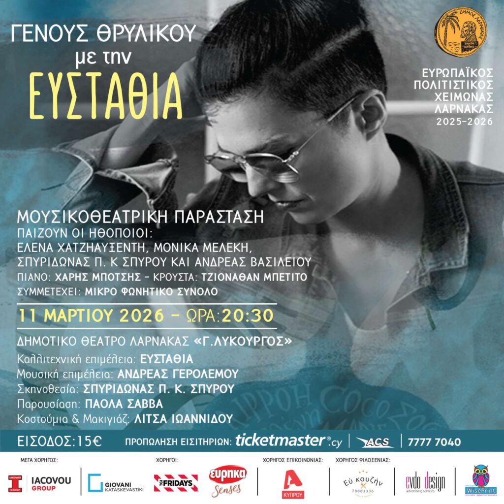 Η παράσταση «Γένους Θρυλικού» με την Ευσταθία, παρουσιάζεται στο Δημοτικό Θέατρο Λάρνακας στις 11 Μαρτίου 2026 στο πλαίσιο του Ευρωπαϊκού Πολιτιστικού Χειμώνα Λάρνακας 2025-2026.